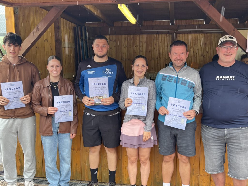 Das Bild zeigt die Vereinsmeister der Einzel- und Doppel-Wettbewerbe zusammen mit dem Vorsitzenden Achim Grüner.